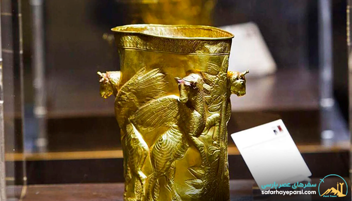 این جام زرین تماماً از طلا ساخته شده و ارتفاع 18 سانتی متری دارد. در وسط این جام یک نقش برجسته از درخت زندگی قرار گرفته و دو گاو بالدار در حال بالا رفتن از این درخت هستند. این جام را نماد قوم «آمارد» می‌دانند.