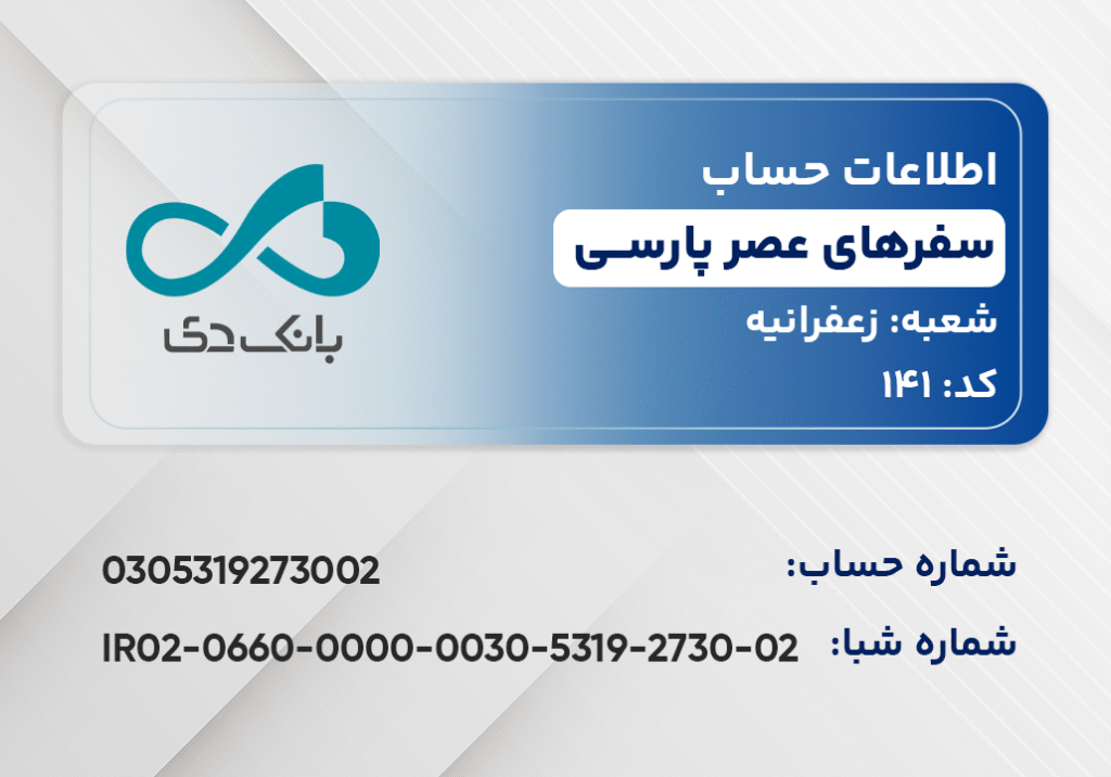 • نام صاحب حساب: شرکت سفرهای عصر پارسی (بانک دی، شعبه زعفرانیه کد 141)